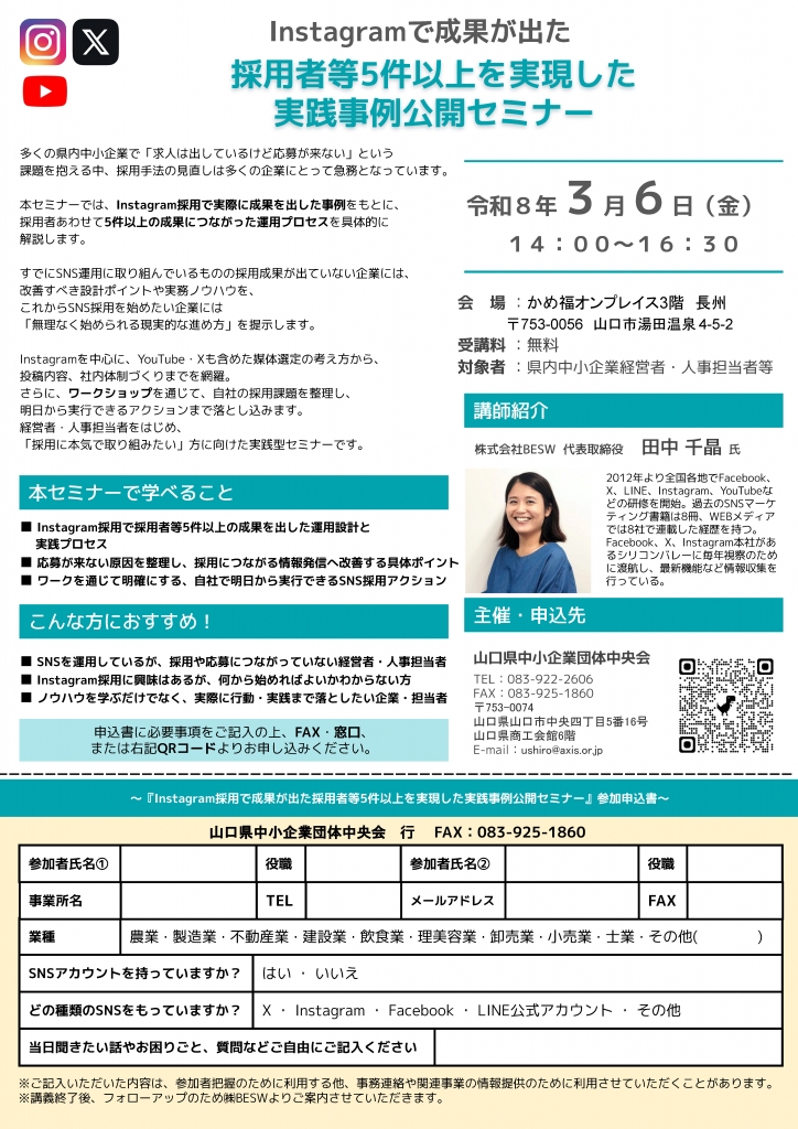 Instagramを中心に、YouTube・Xも含めた媒体選定の考え方から、投稿内容、社内体制づくりまでを網羅。さらに、ワークショップを通じて、自社の採用課題を整理し、明日から実行できるアクションまで落とし込みます。経営者・人事担当者をはじめ、「採用に本気で取り組みたい」方に向けた実践型セミナーです。